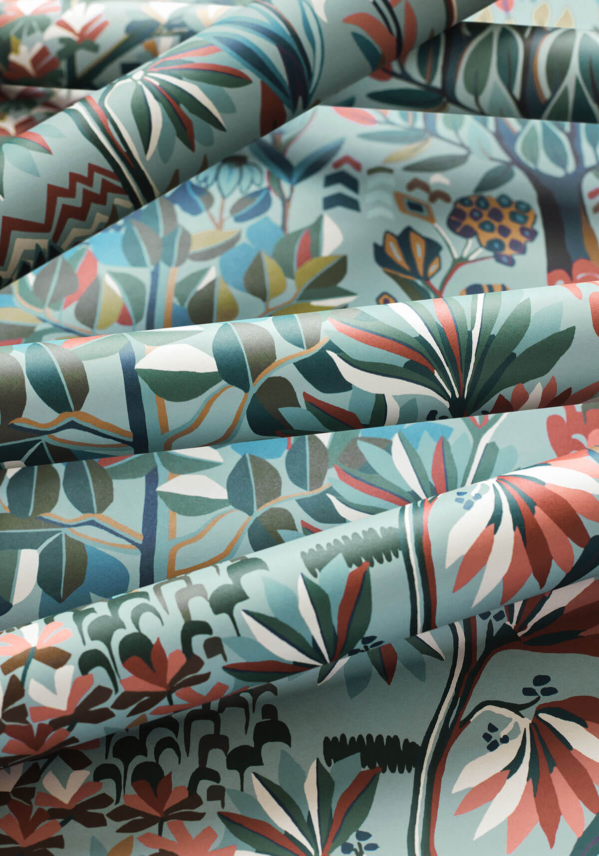 Alpine features a graphic depiction of mountainous trees, shrubs, and flowers inspired by a tapestry. The large scale pattern has a lively aesthetic, offered in colorful and vibrant combinations of mineral blues, sunbaked reds, and subdued naturals. Thibaut Vista is a warm and inviting collection of contemporary wallpaper inspired by nature's beauty. From geometrics reminiscent of mountainous peaks to graphic botanicals of flowering cacti, Vista evokes the excitement of the great outdoors in a modern way. The collection presents an earthy color palette.