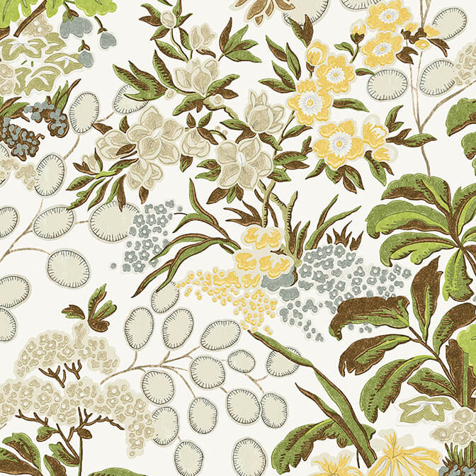 A lush field of flowers grows wildly in this large-scale pattern. Wild and organic, Meadow features money plant seeds that add an airy, circular motif to the stylized florals and leaves. Subtle, pale tones in sage and blush exude refinement and elegance, while an earthier brown adds warmth while telling the bold floral colors to pop. Sojourn is an alluring Thibaut collection of fabrics and wallcoverings that encapsulates a fanciful, faraway land. Coordinating companion prints feature geometric lines, trellises, and abstract corals. Sojourn's color palette varies from earthy tones and soft blushes to vivid blues and lavenders - an escape for everyone.