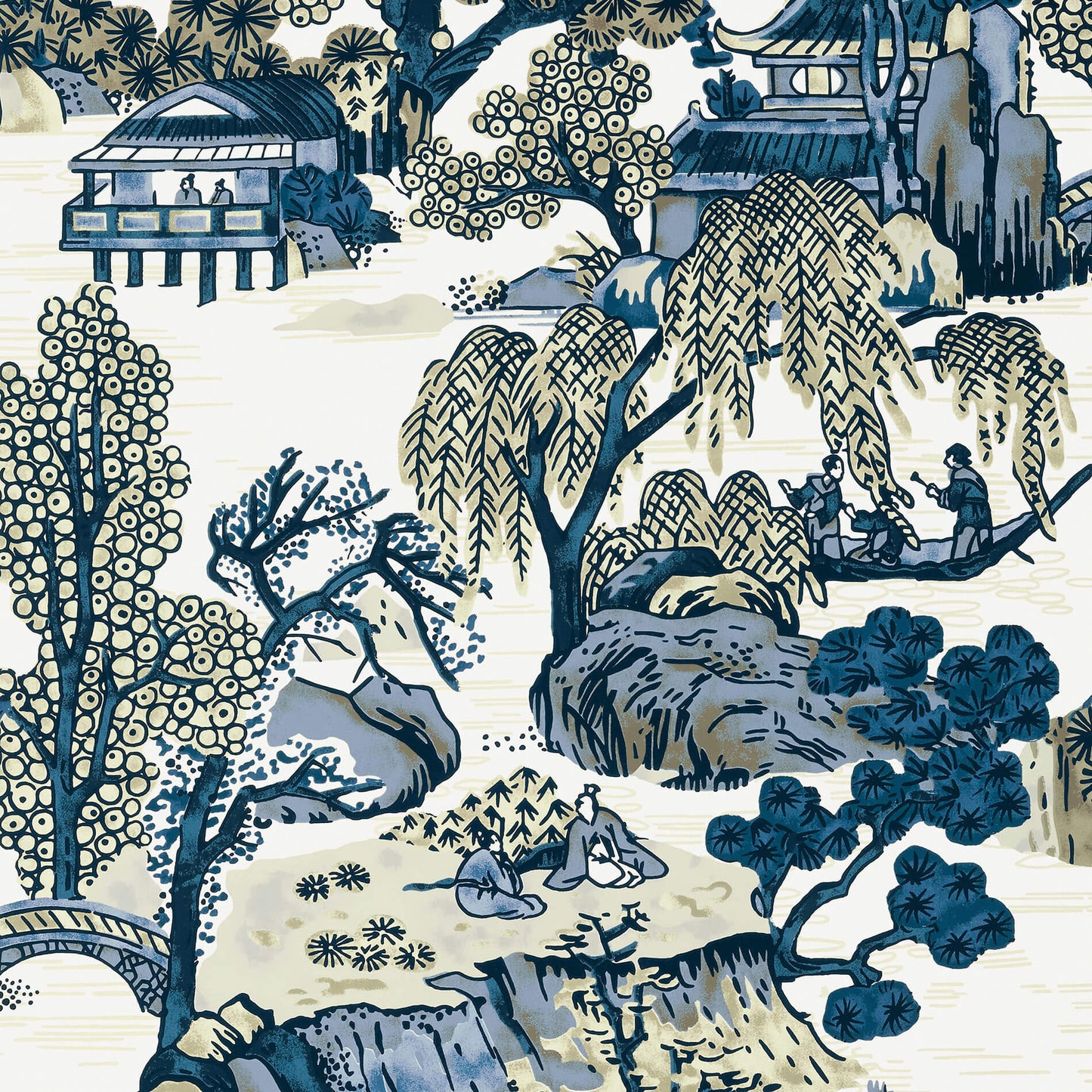 Thibaut Dynasty Asian Scenic Wallpaper - Blue & Beige