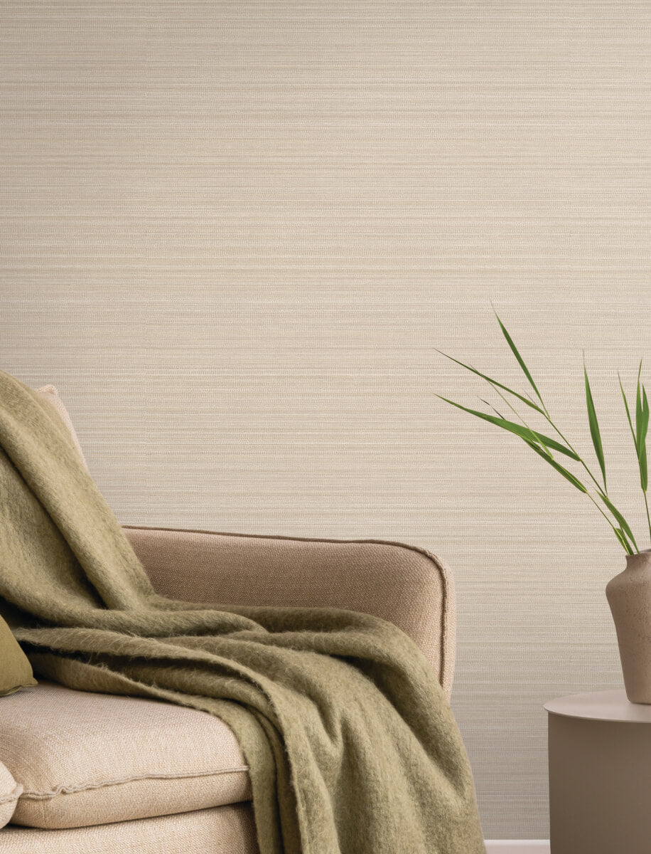 Allineate's horizontal stripes of variegated color are enhanced and amplified by the repetition of regimented folds with textural emphasis, shown in dune beige. This Allineate Wallpaper measures approximately 27 inches wide by 27 feet long, measuring approximately 60.8 square feet per roll. The glamour of metropolitan life inspires this sophisticated collection of classic, geometric, and textural High Performance Type II products styled for residential and boutique commercial spaces.