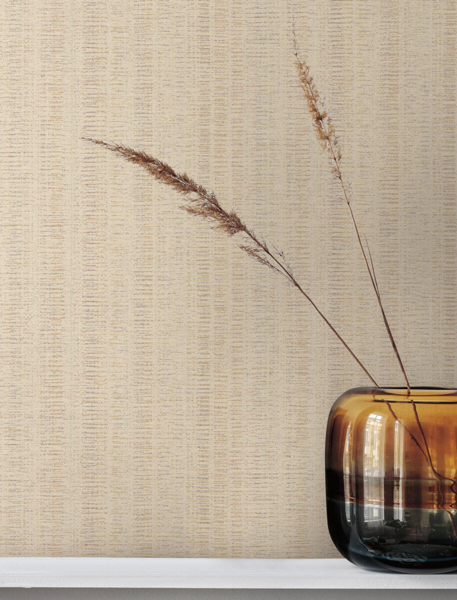 The vertical stripes of Stratford are created from dots and dashes kissed with hints of metallic against a ground of essential contemporary color, shown in harvest tan. This Stratford Wallpaper measures approximately 27 inches wide by 27 feet long, measuring approximately 60.8 square feet per roll. The glamour of metropolitan life inspires this sophisticated collection of classic, geometric, and textural High Performance Type II products styled for residential and boutique commercial spaces.