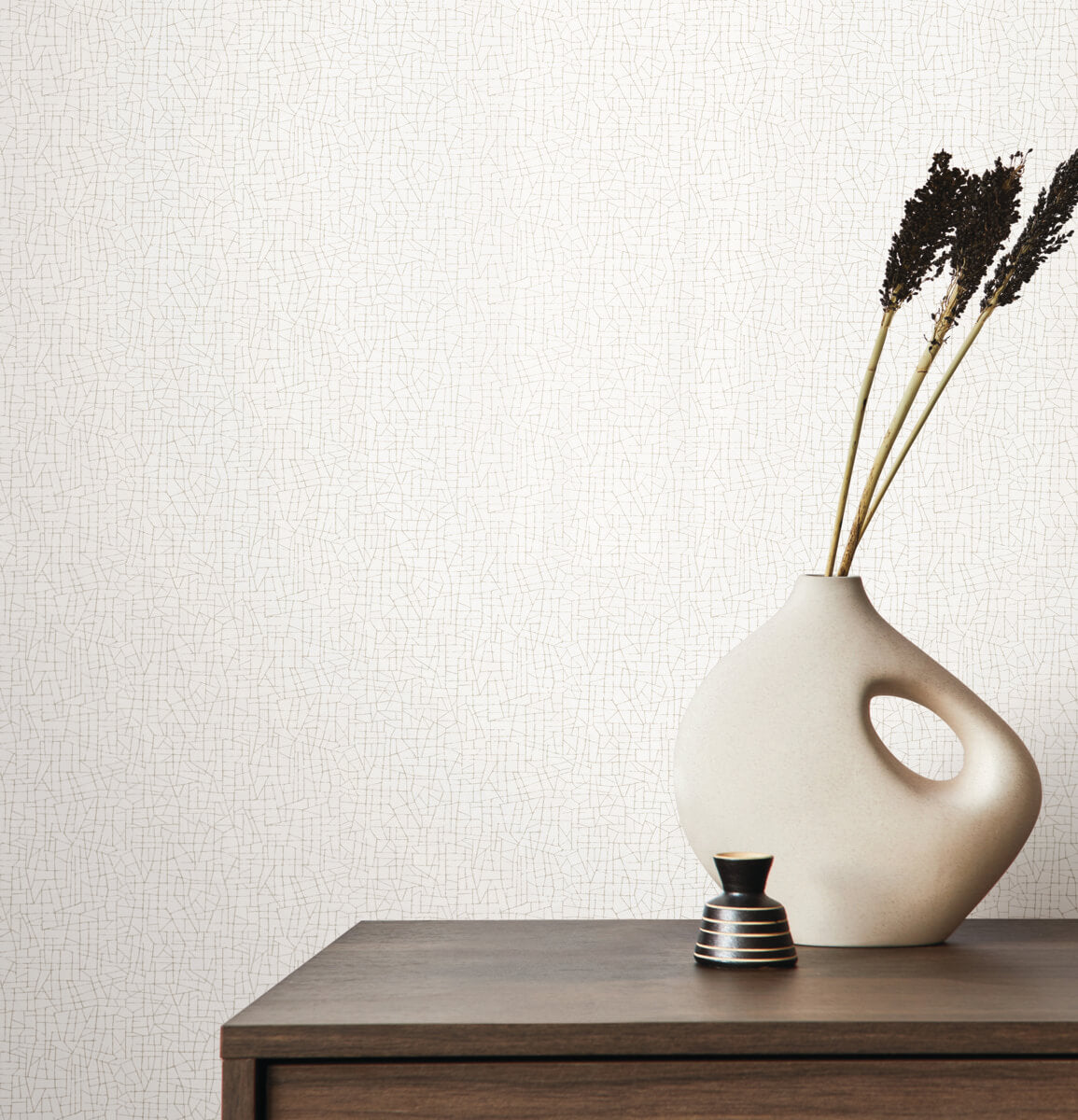 Exchange's small, unique, fractured lines feel like an artisanal installation rendered in burnished metallic against a textural plaster ground, shown in pearl white with burnished metallic.. This Exchange Wallpaper measures approximately 27 inches wide by 27 feet long, measuring approximately 60.8 square feet per roll. The glamour of metropolitan life inspires this sophisticated collection of classic, geometric, and textural High Performance Type II products styled for residential and boutique commercial spaces.