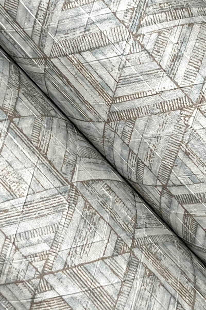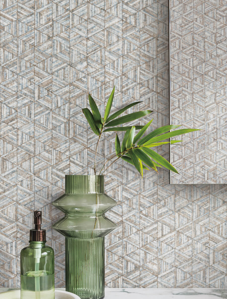 The triangles of Rune shift and shimmer as they form a modern linear geometric of diamonds within diamonds across a pearled canvas, shown in blued pewter grey. This Rune Wallpaper measures approximately 27 inches wide by 27 feet long, measuring approximately 60.8 square feet per roll. The glamour of metropolitan life inspires this sophisticated collection of classic, geometric, and textural High Performance Type II products styled for residential and boutique commercial spaces.