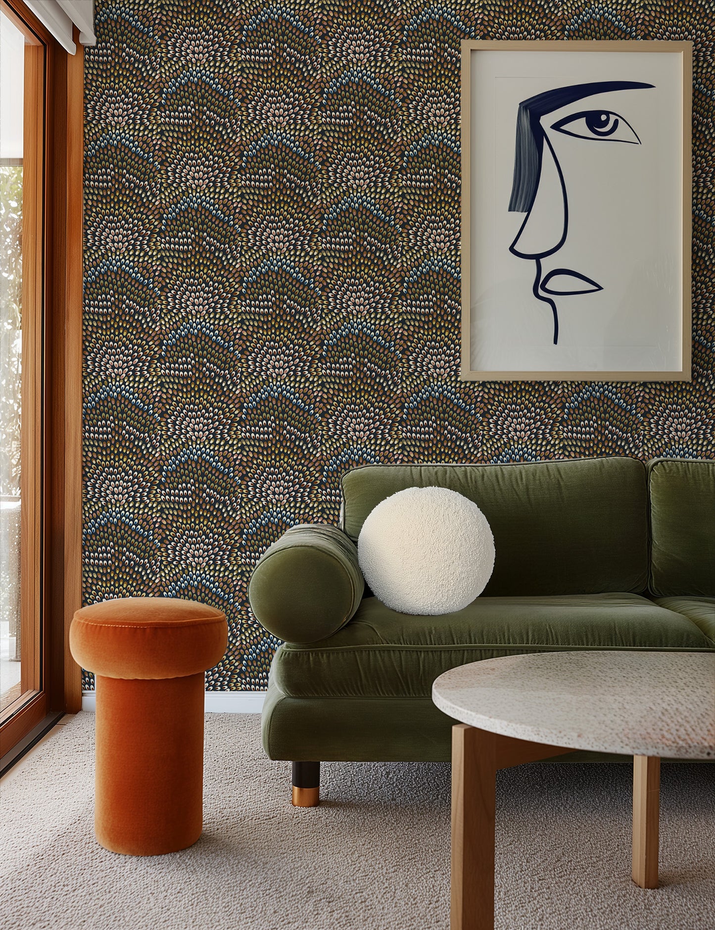 Jandaya is a vibrant and bold wallpaper pattern that features repeating columns of tropical bird-like markings. The colorful design is inspired by the lush and exotic life of the tropics, bringing a touch of color to any space. The intricate patterning is a feast for the eyes, with each roll offering a new and mesmerizing display of color and form. Whether you're looking to add a wild touch to your home or simply want to make a statement with your wallpaper choice, Jandaya is the perfect choice for those who want to live and work in color. Bold, modern wallpaper designs by Mitchell Black. Explore artistic patterns, vibrant colors, and statement wall coverings made to elevate any space.