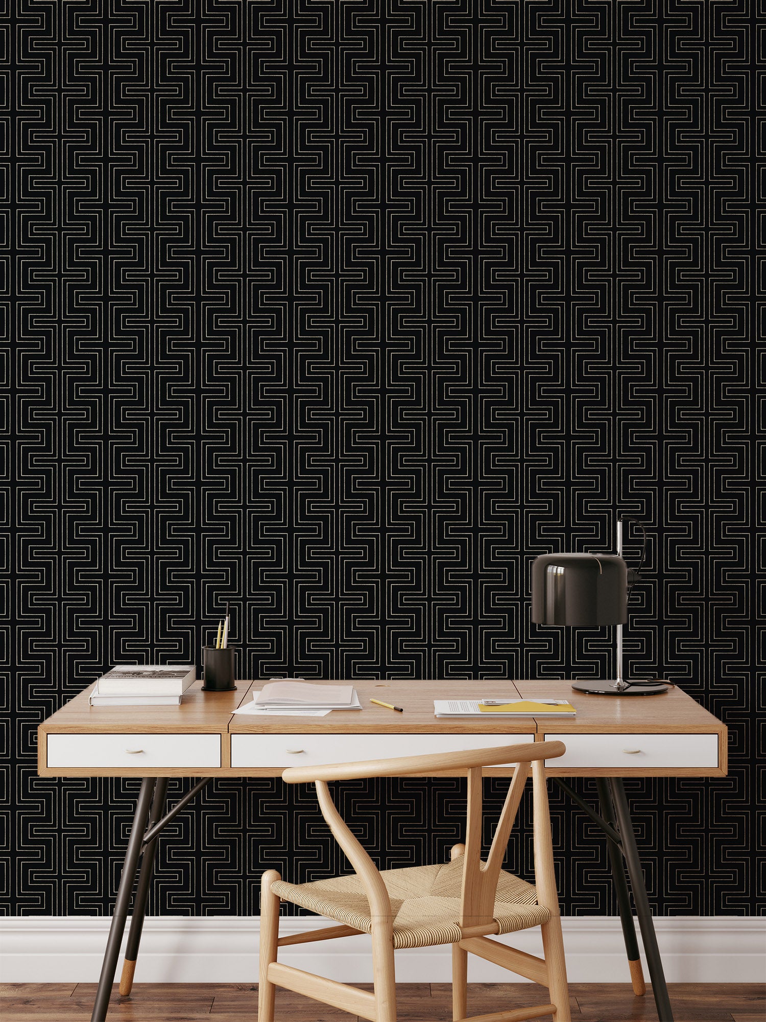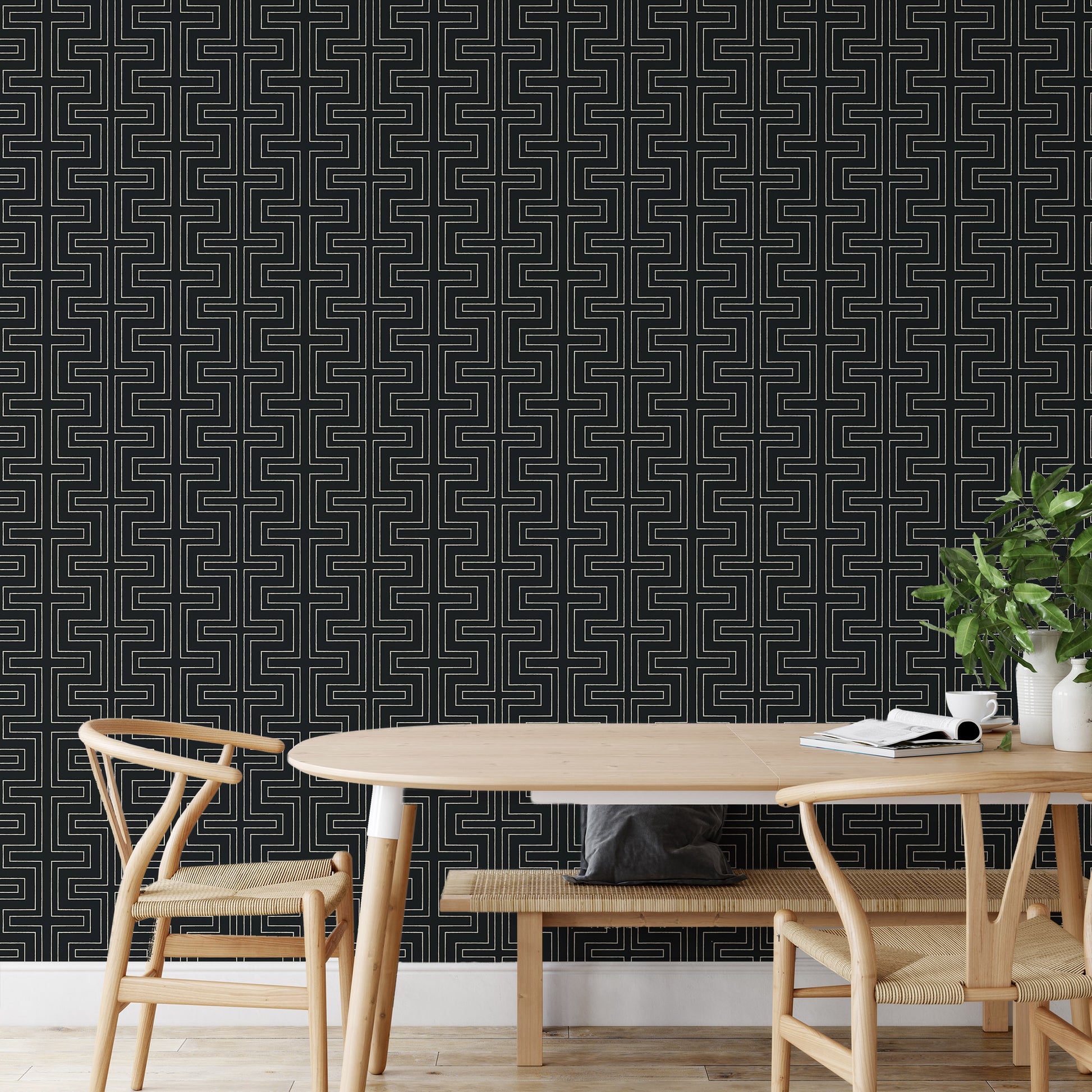 Our Halsted -Onyx Wallpaper pattern from the CO-ED collection. CO-ED is our newest grouping of patterns that were designed with shared spaces in mind. Whether it be a new home office or a common living area, enliven your space with bold designs that have a masculine edge. CO-ED has patterns you can live and work with that do not compromise quality or style. Bold, modern wallpaper designs by Mitchell Black. Explore artistic patterns, vibrant colors, and statement wall coverings made to elevate any space.