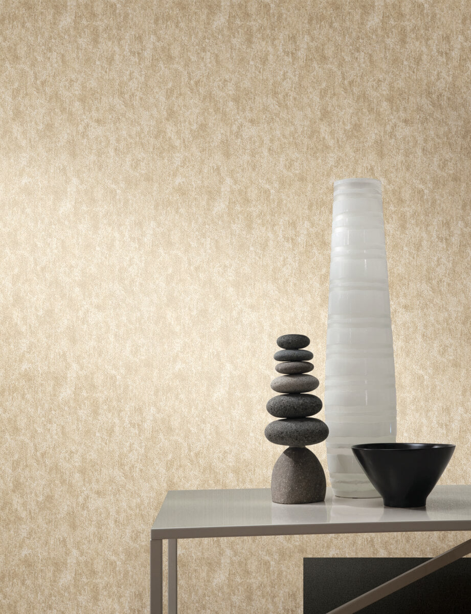 Stippled with metallic across a field of layered, mottled color, pattern Shimmering Patina rivals a weathered, burnished plaster finish, shown in gold metallic on Modern grey. This Shimmering Patina Wallpaper measures approximately 20.8 inches wide by 33 feet long, measuring approximately 57.2 square feet per roll. The long awaited follow-up to the popular first release, Modern Metals Second Edition energizes contemporary spaces with charismatic visual artistry defined by the allure of luminous metallic.