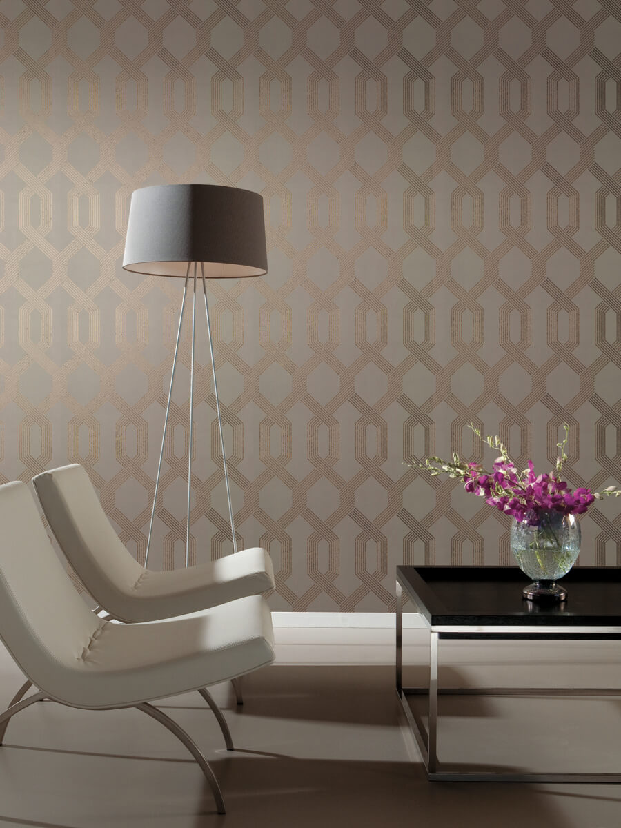 The metallic strands of pattern Viva Lounge wrap and combine to create a sleek Mid-century Modern trellis against a vinyl background.