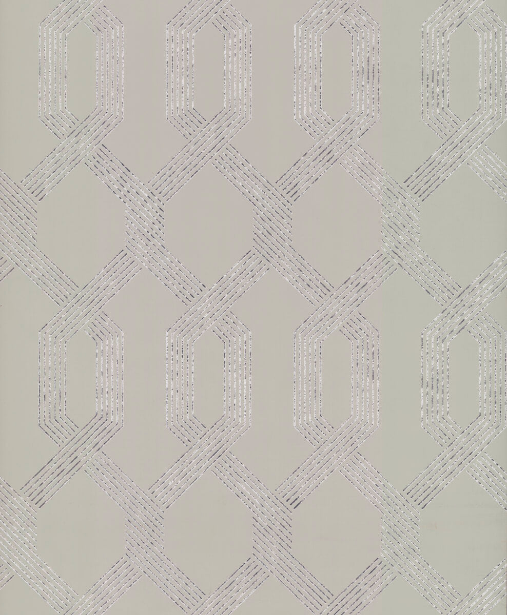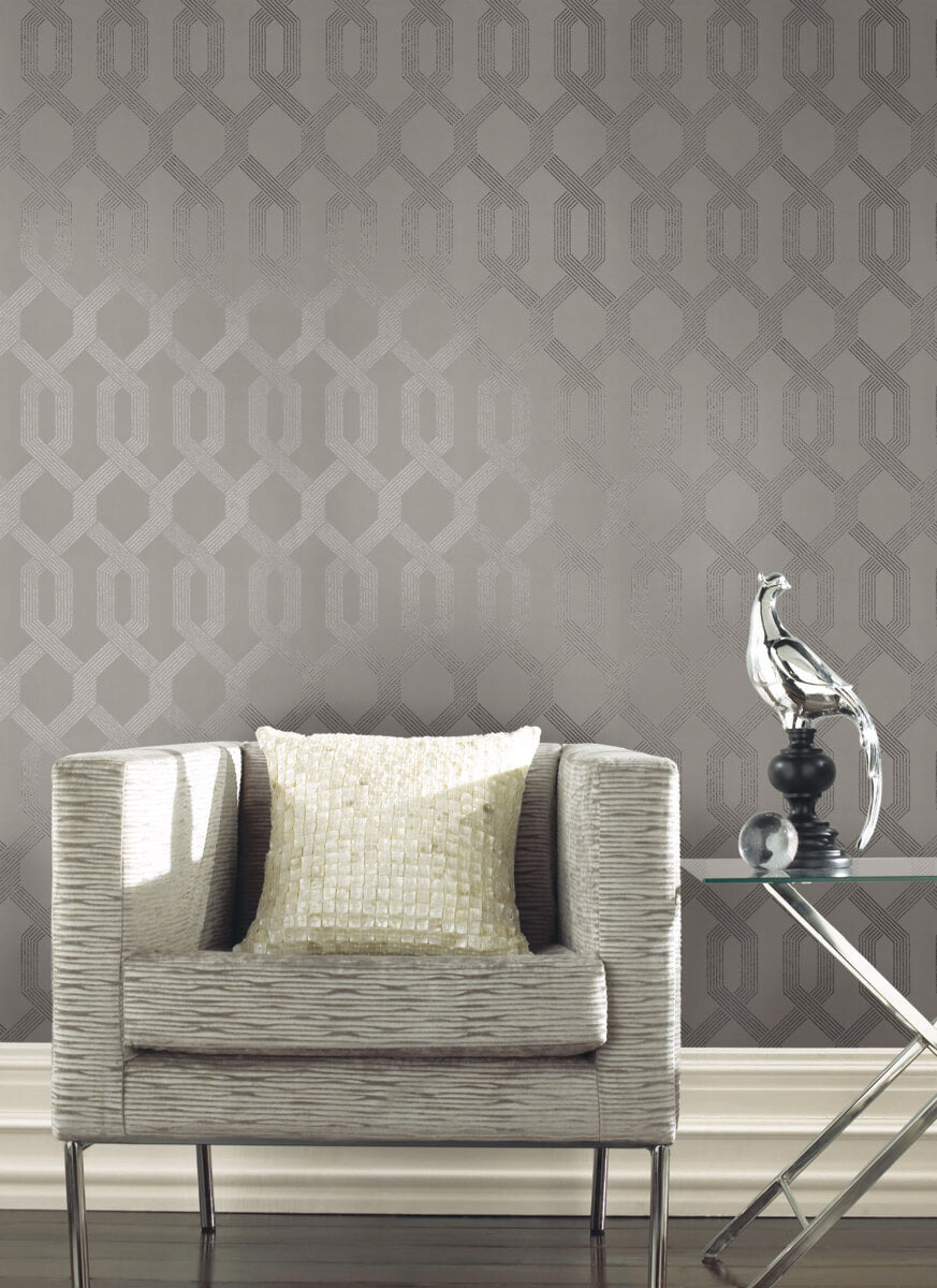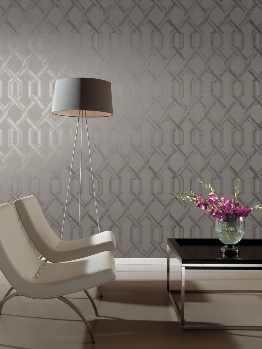 The metallic strands of pattern Viva Lounge wrap and combine to create a sleek Mid-century Modern trellis against a vinyl background.