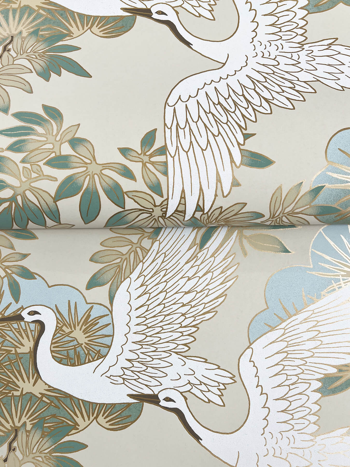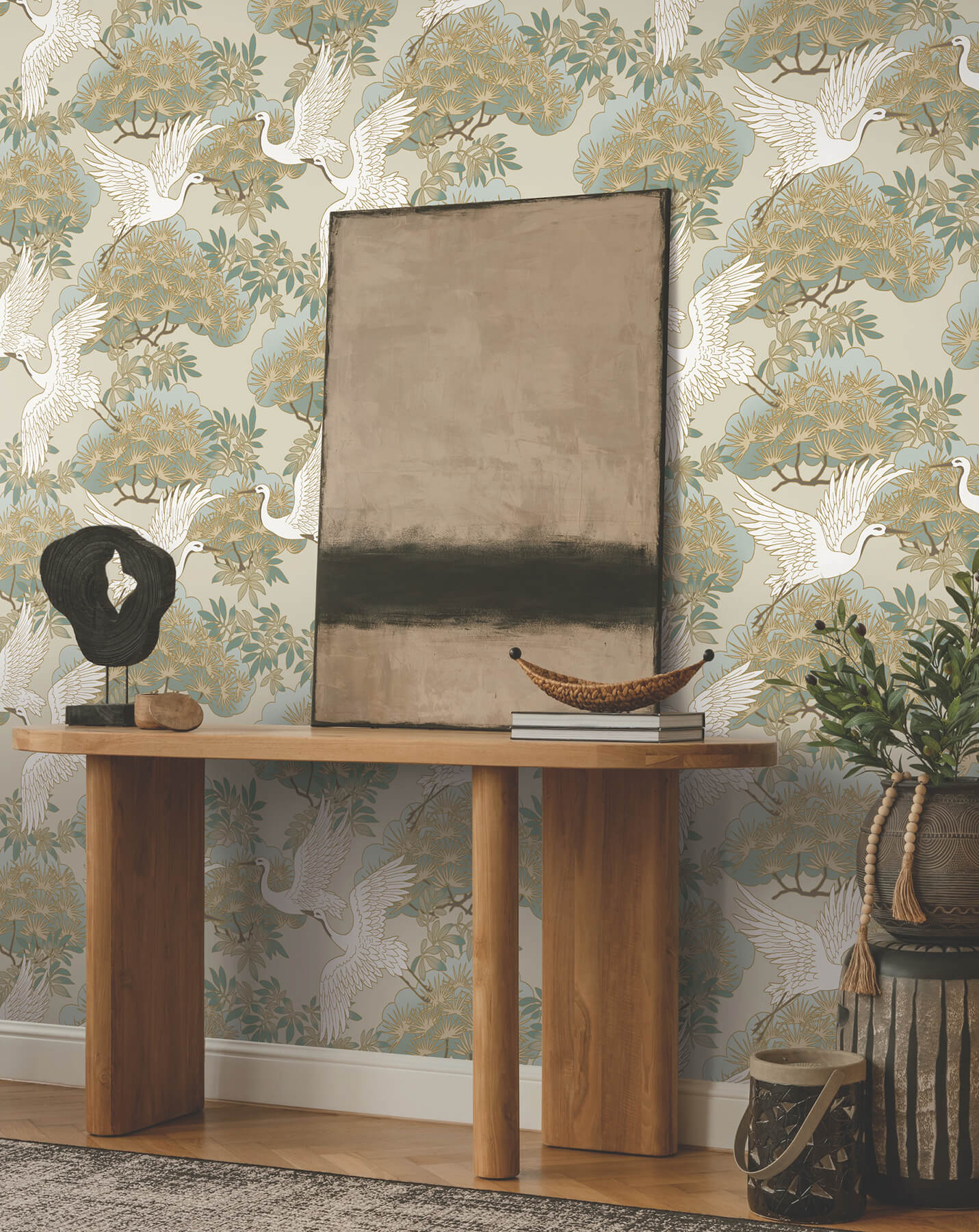 Sprig & Heron’s graceful birds lift their lustrous wings as they fly between beautiful, stylized bonsai trees, shown here in sand beige and greens with gold metallic. This Sprig & Heron Wallpaper measures approximately 27 inches wide by 27 feet long, measuring approximately 60.8 square feet per roll. The tea garden provides a meditative pathway from the outside world to inner tranquility. Experience the quiet luxury and uncompromising beauty within this second edition Tea Garden collection.