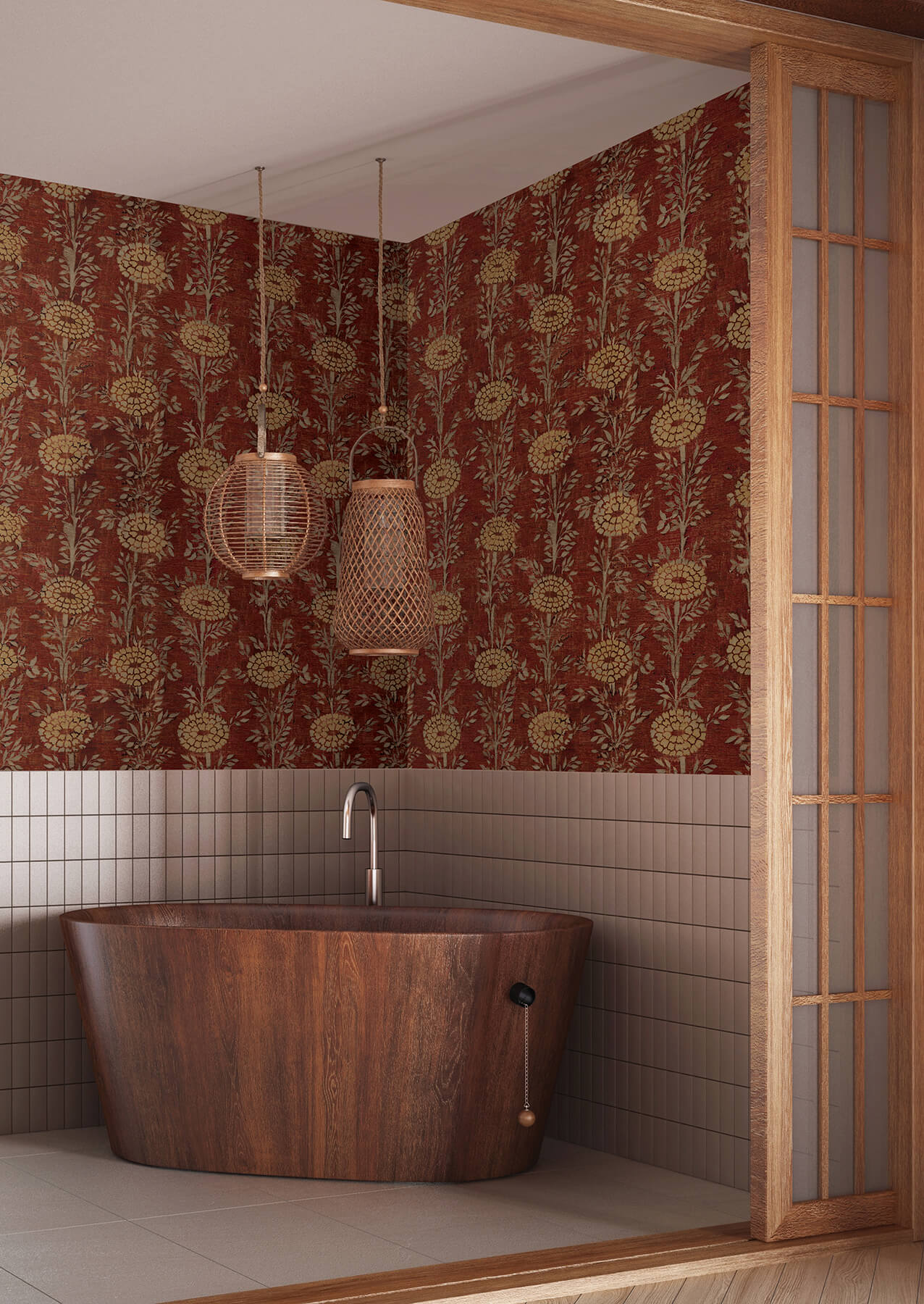 This artistic depiction shows meadows of French Marigold blooms opening their shimmering petals to the sun, shown here in metallic gold, gray, and red. This French Marigold Wallpaper measures approximately 27 inches wide by 27 feet long, measuring approximately 60.8 square feet per roll. The tea garden provides a meditative pathway from the outside world to inner tranquility. Experience the quiet luxury and uncompromising beauty within this second edition Tea Garden collection.