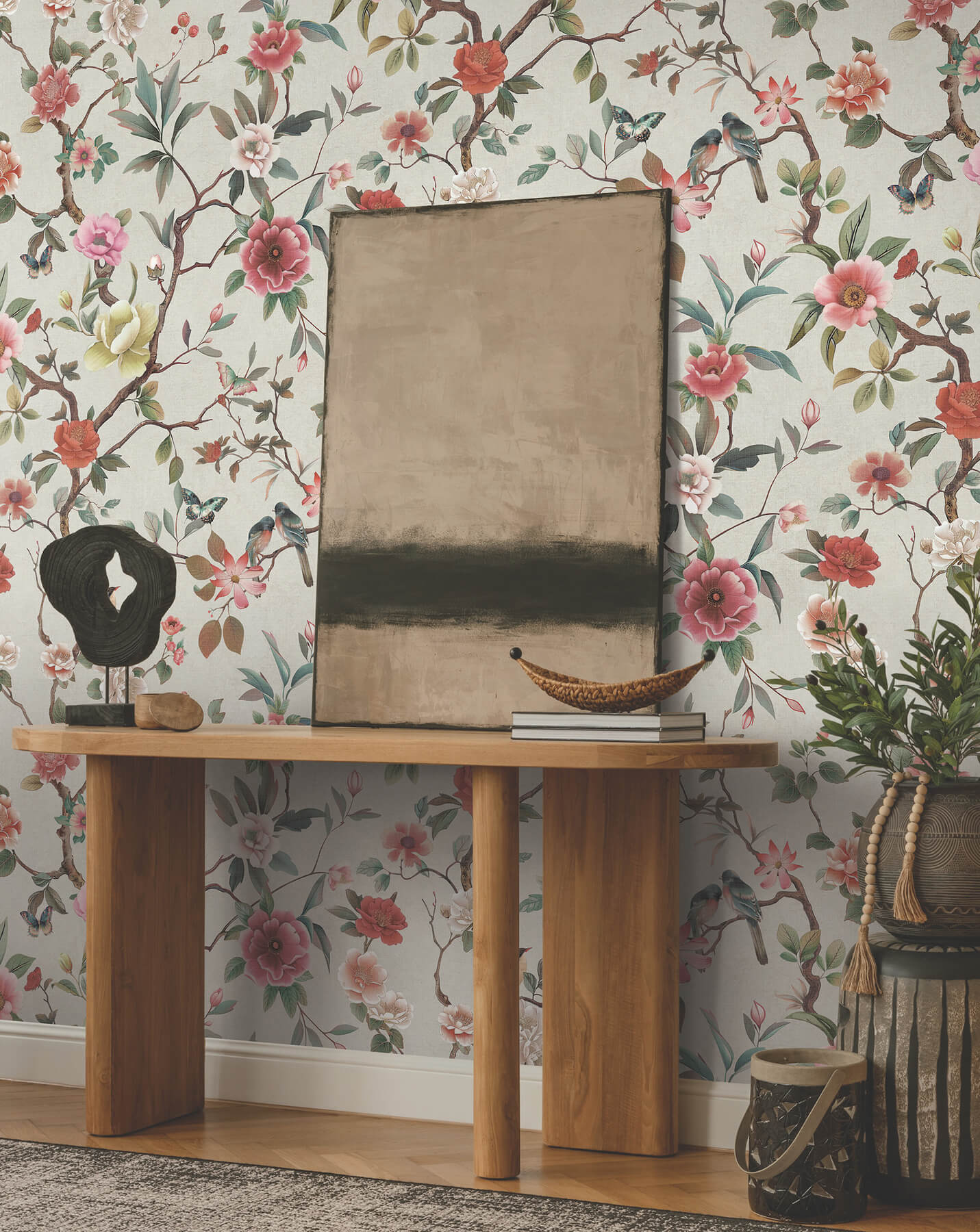 Kimora's Garden blossoms, branches, and birds create a lush portrait of garden splendor captured on an impression of vintage cloth, shown here in pink and green on ivory. This Kimora's Garden Wallpaper measures approximately 33.25 inches wide by 24 feet long, measuring approximately 66.5 square feet per roll. The tea garden provides a meditative pathway from the outside world to inner tranquility. Experience the quiet luxury and uncompromising beauty within this second edition Tea Garden collection.