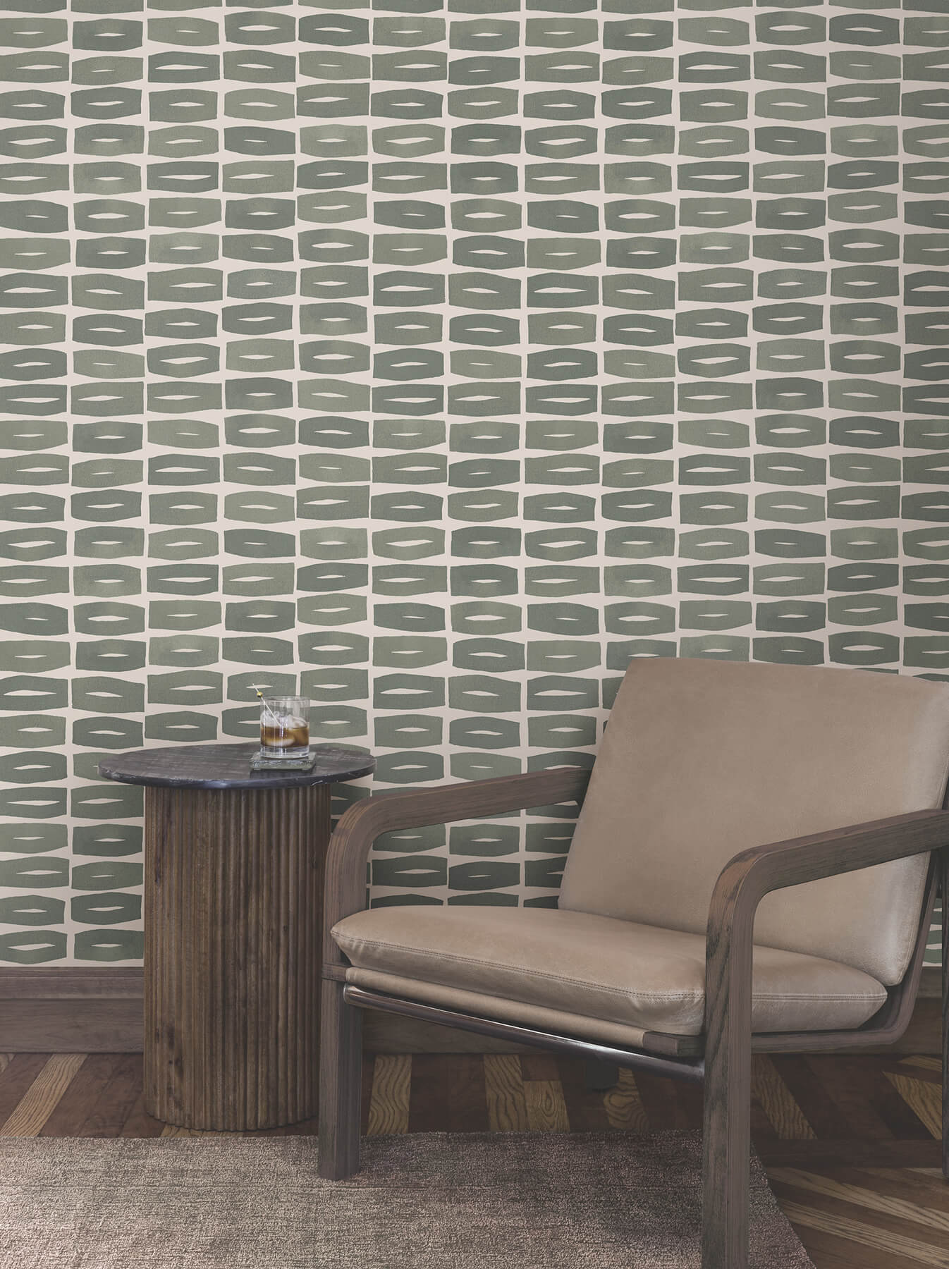 The organically shaped rectangular rings of Modernist Motif offer a facade reminiscent of both tiling and woven accents. Featured here in charcoal grey against pale beige. This Modernist Motif Wallpaper measures approximately 27 inches wide by 27 feet long, measuring approximately 60.8 square feet per roll. Drawing inspiration from the gestural fluidity of turn of the century artwork, Artisan Studio offers an exploration of color, abstraction, and organic forms. Infused with the expressive energy of early 20th-century art, the Artisan Studio collection blends organic forms, abstract lines, and rich color palettes to create walls that feel like curated works of art. Each design captures the gestural movement and fluidity of painterly brushstrokes, offering a fresh take on modern wallpaper with artistic soul. Ideal for those seeking gallery-worthy walls, these premium wallpapers make a statement in living rooms, bedrooms, offices, and creative spaces.